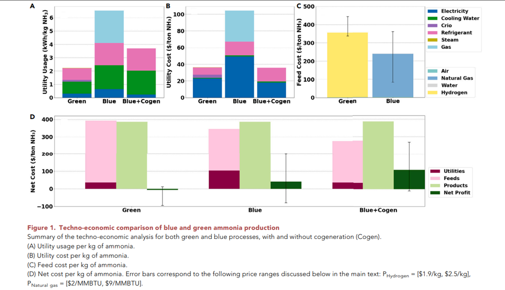 با نگاه دقیق به نسبت‌های مختلف شکل، می‌توان مشاهده کرد که برق (برای کمپرسورها)، آب (برای خنک‌سازی عمومی)، و مبرد (برای جداسازی آمونیاک) مهم‌ترین عوامل بر نیازهای انرژی فرایند سبز هستند. نیازهای کریوژنیک برای جداسازی نیتروژن نسبت به سایر عوامل کمتر است. وقتی به فرایند تولید آمونیاک آبی نگاه می‌کنیم، می‌بینیم که بیشتر سهم انرژی از مبرد جداسازی آمونیاک، آب سردکن، و گاز برای گرمایش راکتورها آمده است، در حالی که برق برای فشرده‌سازی غالب نیست. اگر اکنون واحد کو-ژنراتور را هم در نظر بگیریم، گاز برای گرمایش راکتورها به‌طور مستقیم تامین می‌شود و نیازهای برق تقریباً 40٪ کاهش می‌یابد. با این حال، مصرف انرژی تقریباً 70٪ بیش از فرایند سبز است (2.2 vs. 3.7 kWh/kg NH3) جایی که انرژی تأمین هیدروژن سبز به‌عنوان خوراک در نظر گرفته نشده است. در شکل می‌توان دید که با وجود مصرف بیشتر کل ابزارها (utilities)، هزینه مربوط به فرایند آبی با کو-ژنراتور کمتر از هزینه ابزارهای فرایند سبز است. این نتیجه به‌خاطر این است که فرایند سبز عمدتاً از برق استفاده می‌کند. بنابراین، نتایج تأیید می‌کند که سودآوری فرایند سبز به شدت به قیمت برق وابسته خواهد بود. با این وجود، می‌توان مشاهده کرد که هزینه خوراک غالب بر کل هزینه‌های فرایند سبز است ( شکل C). قیمت‌های بازار مختلف به‌عنوان مثال برای سناریو پایه به‌صورت تقریباً 0.0011 دلار بر کیلوگرم هوا، 0.3031 دلار بر کیلوگرم CH4، 0.0011 دلار بر کیلوگرم آب، 0.3858 دلار بر کیلوگرم آمونیاک، و 2 دلار بر کیلوگرم هیدروژن تخمین زده شد. قیمت گاز طبیعی با حدود 6 دلار به ازای هر MMBTU در بازه قیمت‌های Henry Hub NaturalGas Spot Price  قرار می‌گیرد که از سال 1998 بین 2 تا 12 دلار به ازای هر MMBTU معامله شده است.